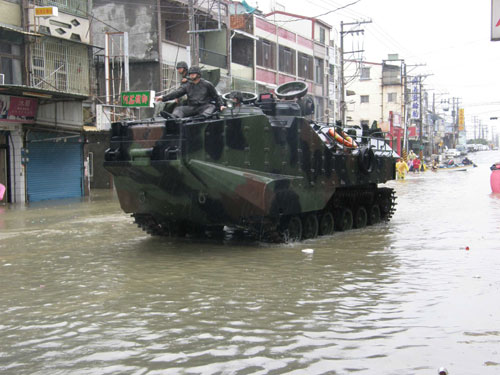 “凡亚比”台风造成高雄县多处乡镇淹水,积水20日仍未消退,台军派出两栖战车投入救灾。(“中央社”图)