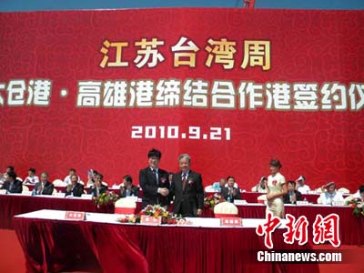 中新网太仓9月21日电 (记者 周建琳 唐娟)21日,在太仓港集装箱码头,太仓港与高雄港正式结为“姐妹港”。台湾高雄港萧丁训局长和太仓港港口委员会梅正荣主任共同签署了太仓港与高雄港缔结合作签约。