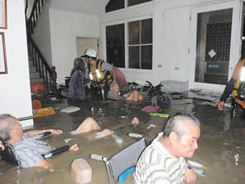 位于冈山和平里的普德养护中心,十九日下午三时许开始淹水,因只有三名女工作人员留守,仅先将十名体重较轻的老奶奶移到二楼,剩下十九名老人无力移动,只好打电话通报,让这群老人们就待在一楼,泡在水中超过三十分钟,直到救难人员来才脱困。