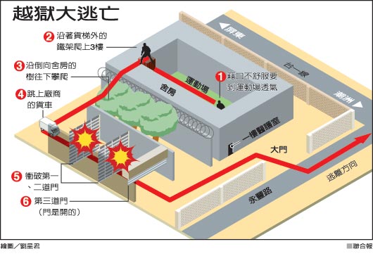 中新网9月24日电 碰!碰!两声破门巨响后,原本平静的屏东看守所瞬间被尖锐的警笛声覆盖。有30多项前科的通缉犯林清龙被捕回笼后,23日下午趁狱警不注意,先攀爬货用电梯并翻越两楼高的狱舍,脚踹追捕狱警,再沿着矮树跳到中庭广场,坐上未熄火的货车,连撞两道铁门,从看守所大门扬长而去。过程不到十分钟,越狱情节比电影还刺激。