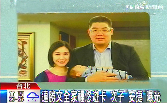 中新网9月25日电 据台湾TVBS电视台报道,连战长子连胜文和儿媳蔡依珊为保护孩子,坚持不让连定捷、连安捷两个孩子轻易曝光,不过最近上千名国民党代表,都收到一份别致的小礼物--蔡依珊、连胜文抱着连安捷一起拍合照制作成上千张悠游卡,连安捷可爱的的模样也首度曝光。