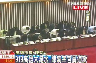 中新网9月28日电 据台湾TVBS报道,针对919“凡亚比”台风造成高雄市大淹水,市长陈菊连日来遭到相当多的指控,今日,在市议会总质询时,陈菊特别率领市府官员向市民道歉。