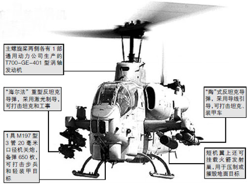 AH-1W武装直升机机长约18米,高4米,最大起飞重量近6700公斤,采用串列座舱设计,由2名机组成员操控,装备有机关炮、火箭弹、空空导弹和反坦克导弹,是目前台军直升机部队中攻击力最强的机型。(何西)