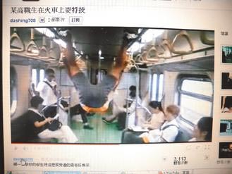 该名学生除在行进的列车上倒挂外,一度放开两手,只以双脚勾住拉杆,甚至“换单边倒挂”玩特技,一旁正在阅读的旅客无奈地看着他“演出”。