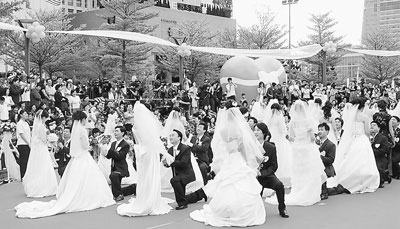 联合婚礼、集团结婚……大陆读者对这些新词可能感到陌生,其实一解释您就恍然大悟,这就是大陆也曾风行一时的集体婚礼。眼下大陆的集体婚礼热有退潮之势,在台湾却仍“风景独好”。