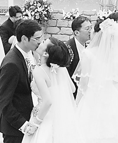 联合婚礼最浪漫的环节莫过于求婚和亲吻环节了。粉色气球搭起拱门,玫瑰和百合装点“城堡”,上百对身着白色婚纱和深色西服的新人携手鱼贯入场,在主礼嘉宾和无数围观者的见证下,新郎齐刷刷单腿跪下向新娘求婚,双方交换戒指后亲吻99秒,证婚人还要下场监督,嘉许吻得最投入者……如此壮观、难忘的婚礼,听说许多大陆民众也跃跃欲试呢。也许在不久以后,我们将看到来自两岸的新人在台湾举办“联合婚礼”。(记者 王尧)