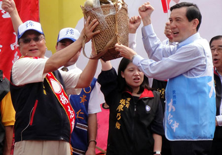 国民党台中市长参选人胡志强台中市竞选总部10月13日成立,国民党主席马英九(前右)亲自到场赠送金蛋给胡志强(前右2),象征胡志强是会生金鸡蛋的母鸡。(“中央社”图)