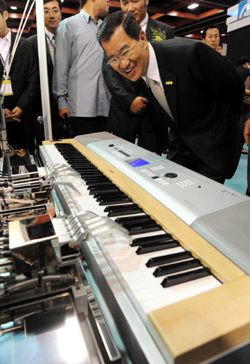 “2010台北国际机器人展”19日在台北世贸展览馆展开,萧万长(前)出席开幕仪式,对于机器人的创新设计表示赞赏。图片来源:“中央社”