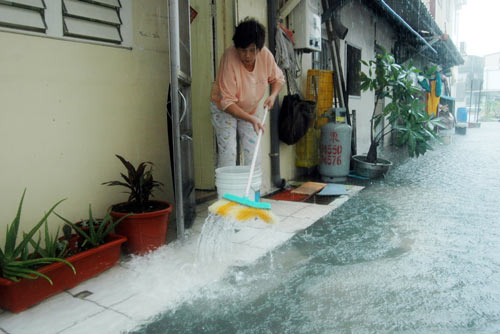 宜兰县 21日降下豪雨,罗东镇万长春圳附近有7户民宅后方的厨房与道路淹水,居民赶紧扫出积水。