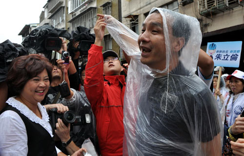 梅姬台风转往北,为台北县带来雨势,国民党新北市长参选人朱立伦(右)21日冒雨在传统市场争取支持,随行人员为他穿上雨衣。
