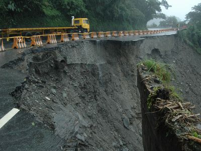 遭遇豪雨的苏花公路遇雨则坍,南方澳到东澳间多处坍方。台湾“灾害应变中心”表示,一辆弘泰旅游公司载运大陆观光客的游览车在东澳受困,疑被落石击中,大陆导游及司机困在变形车体内,深夜确定2人死亡,其他旅客无恙;另传有一辆创意旅游公司的游览车,搭载广东团共19人失联。