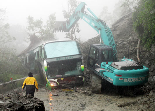梅姬台风的强风豪雨让苏花公路柔肠寸断,工程人员上午全力抢信道路救援受困的民众。