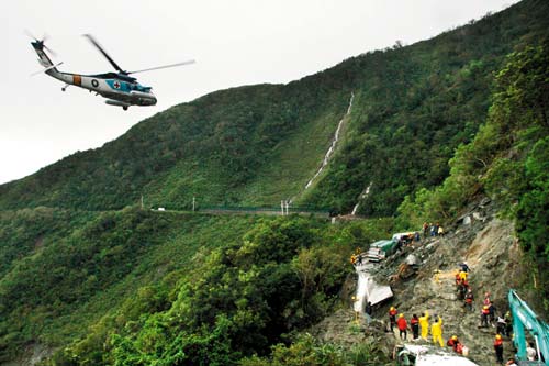 空援同时,台军特种作战部队、消防部门特种搜救队都出动,“公路总局”以重型机具清道,只是山坡壁已成泥石浆,才一挖,旁壁的土石又流下,如此重复施作,最后终于勉强清出一条便道。