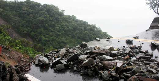 “鲇鱼”带来豪大雨冲毁苏花公路,112至116公里处大面积坍方,多人受困,位在苏花公路入口的东澳桥前晚就拉起警戒线,警告前方的路危机四伏。记者昨天上午7时从花莲这头118里处挺进宜兰,来回5个小时的直击之旅,沿途碎石、断木横卧,山壁不时喷出猛泉,湍急而下,台九线顿成滑水道,走在路面像溯溪。