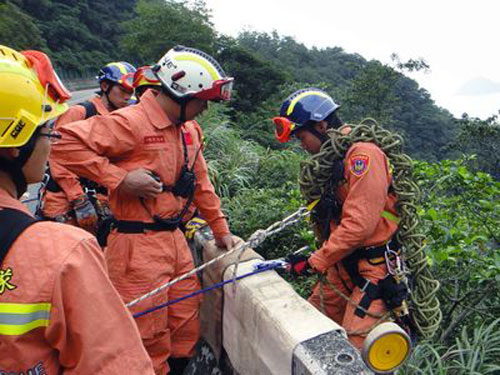 历经40分钟路程,来到116公里处,前方已一大片塌方,无法再向前。不到片刻,一群身穿橘衣、步伐整齐的台北市搜救队朝这走来。在短暂的集合、下达指令后,搜救队员系着绳索,一个接着一个从路边护栏缓缓垂降,搜索生还者及车辆残骸。