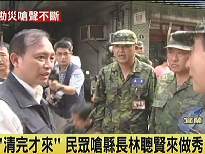 昨天天气短暂放晴,宜兰县长林聪贤巡视淹水灾区,却出现不寻常的现象,几乎走到哪就被骂到哪,一名民众说,都淹了好几天了,还是靠着台北的女儿上网把淹水的情况公布给大家知道,县长这个时候才到。也有老妇人说,淹水的时候看不到县政府的人员前来,还不是靠着自己的力量清理家园,都快清得差不多了,县长才出现。