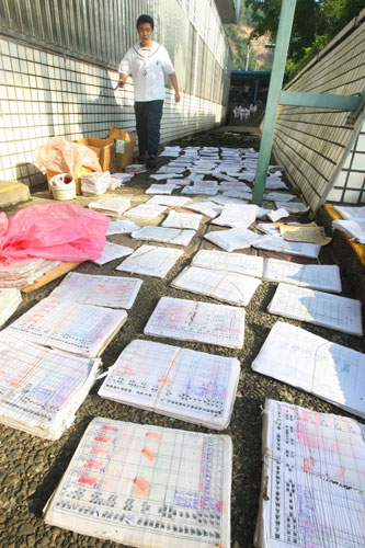宜兰地区暴雨成灾,损失惨重的苏澳海事水产职业学校25日灾后第1天上课。学生的奖惩纪录文件被放在走廊上晒太阳。图片来源:“中央社”