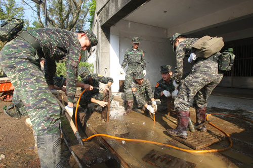 宜兰地区暴雨成灾,台军25日在损失惨重的苏澳海事水产职业学校帮忙清洁消毒。图片来源:“中央社”