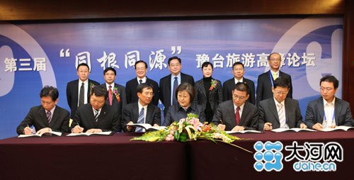 会议期间河南省旅游局分别与台湾多家旅行社签订战略合作协议,就相关豫台旅游合作事宜达成共识。据悉,活动期间还将在新郑举行“同根同源·共拜先祖”活动,并组织与会者参观考察河南各地市的旅游市场。