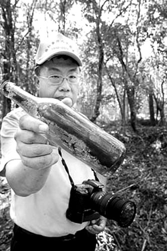 安达山战壕一带茅草丛生,步行至此需4个小时。过去,当地猎人都把战壕当成一般洞窟,直到文史学者得到猎人捡到的两枚迫击炮弹弹壳,经反复追查,才确定此地是日军战壕。寻访过程中,一行人还在壕沟内捡到一只玻璃酒瓶,瓶身上刻有“日本麦酒矿泉株式会社”的字样。岛内文史工作者程士毅表示,日军当年应该是做好了长期打仗的准备,从工事面积及指挥所规模推测,战壕约可容纳一个加强营约100名士兵。