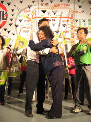 高雄市长陈菊27日晚间到台中县,为民进党台中市长参选人苏嘉全站台,2人在舞台上来一个“大熊抱”。 图片来源:“中央社”