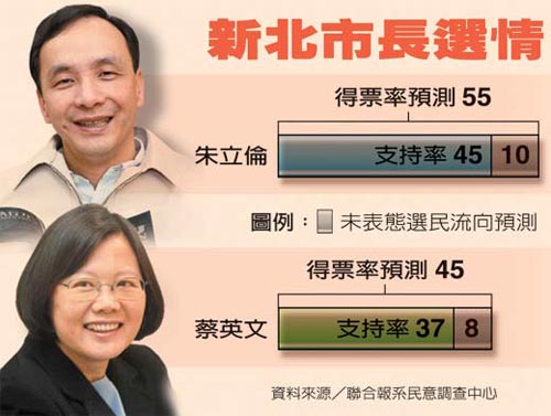 年底新北市长选战,将由民进党蔡英文迎战国民党朱立伦。调查发现,朱立伦目前获得四成五选民支持,三成七力挺蔡英文。