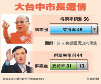 分析显示,胡志强在台中市获得五成五支持,二成九挺苏嘉全;台中县选民观望比率较高,四成五力挺胡,三成二属意苏。