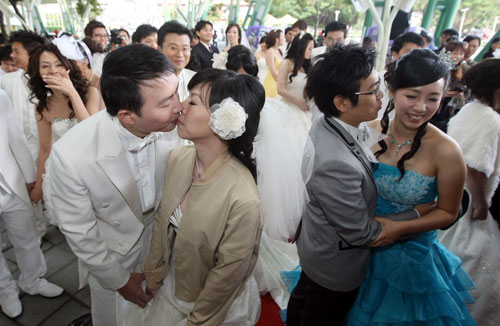 台湾“甜蜜新人拍婚纱迎花博”记者会1日在花博圆山园区举行,50对新人齐聚园区深情拥吻,留下甜蜜回忆。图片来源:“中央社”