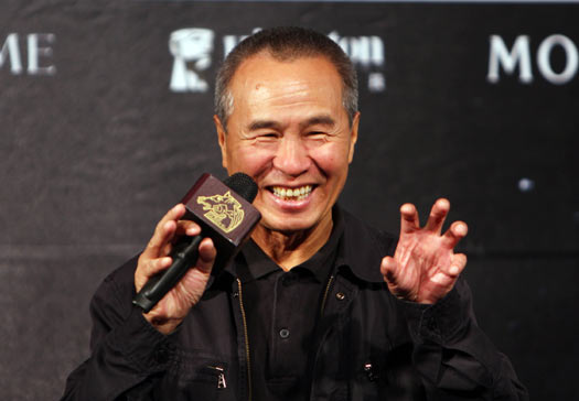 金马影展开幕记者会 4日在台北君品酒店举行,金马影展主席侯孝贤摆出宣传广告中的表情,宣告影展正式开始。图片来源:“中央社”