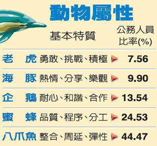 中新网11月5日电 据台湾《联合报》报道,根据台湾“人事行政局”地方行政研习中心所做调查,台湾具“八爪鱼”动物属性的公务员最多,达四成四;具领导性格的“老虎”最少,不到一成。与其他地区相较,台湾的地方公务人员虽然八面玲珑,但较欠缺主动性格。
