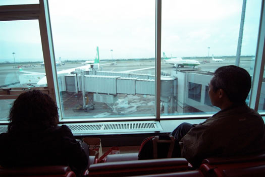 陆客家属5日搭机离台,面对仍下落不明的亲人,不少人一脸忧愁,在候机时远望飞机起降。