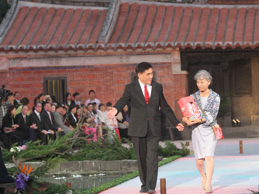 台北市长郝龙斌(左) 4日出席在林安泰古厝举行的花博开幕记者会暨“花‧裳”展演,邀请“世博奶奶”山田外美代(右)以观光大使身分,号召欣赏花博之美。