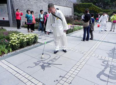 台北花博会,陜西西安6位民众组成“轻描淡写”书写团,正在西安展园用地书笔蘸清水,在地面进行书法书写,除了低碳又环保,还能锻炼身体。图片来源:“中央社”