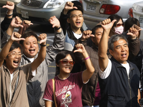 高雄地检署11日针对“废弛职务案”首度传讯高雄市长陈菊,反对者在陈菊出庭后,比著下台手势高喊“陈菊下台”。 图片来源:“中央社”