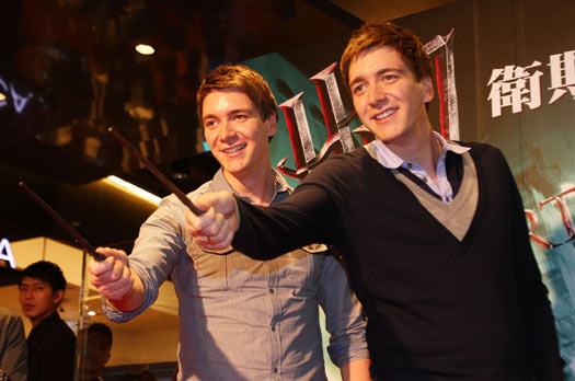 詹姆斯(左)与奥立佛菲尔普斯(右)16日在台北出席见面会, 2人特地带来在电影中使用的“魔杖”,并表示希望影迷出席晚间的首映会。