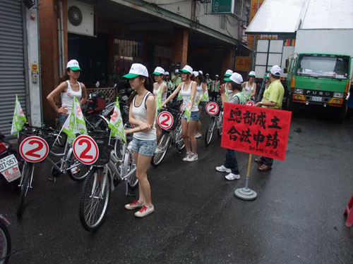据报道,在不到20度的低温下,10几个身穿无袖,加上短到不能短的热裤,浩浩荡荡的替高雄市小港区顺苓里里长候选人吕在和辅选,这群辣妹一大早就在吕在和的竞选总部集合,然后骑着单车扫街拜票,组了一团单车辣妹团沿街拜票。
