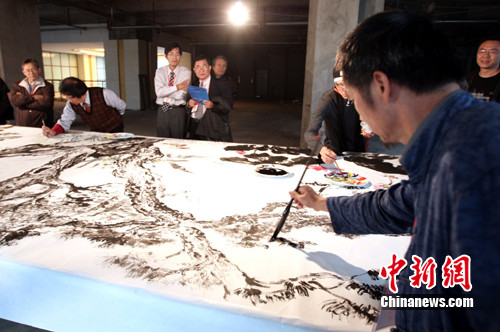 中新网重庆11月18日电 (孟幻)11月18日,来自海峡两岸的画家在渝共同挥毫绘制寓意两岸同根同源的“盛世百花百鸟图”。