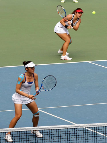 广州亚运网球女双22日决赛,中华台北队姊妹PK,詹咏然(后)与庄佳容(前)以直落二击败张凯贞、谢淑薇,摘下金牌。 图片来源:“中央社”