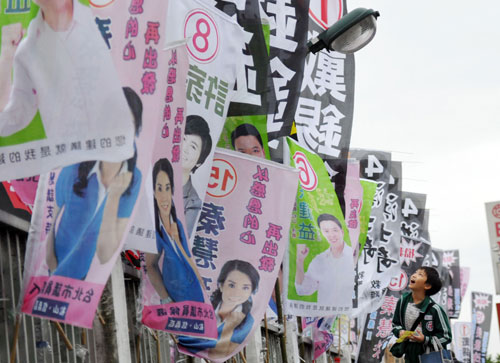 选战开打,台北市天桥上密布市议员竞选旗帜,放学路过学童看得瞠目结舌。 图片来源:“中央社”
