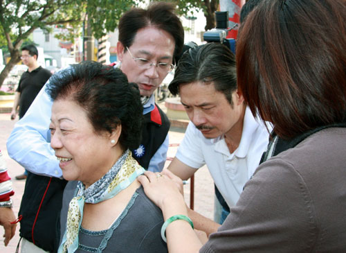 国民党秘书长金溥聪(后右)24日陪国民党大台南市长候选人郭添财(后左),到台南县新营市太子宫参拜时,应民众要求在衣服上签名。 图片来源:“中央社”