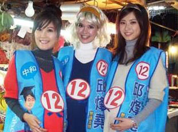 “政大4姬”中的柯念萱、高玉颖、沈易儒扮孕妇,以“大腹力挺”的人体广告,进入热闹的菜市场拜票,其中,混血儿柯念萱更是以金发造型,高喊“冻蒜(当选)”,吸引爆满民众围观。