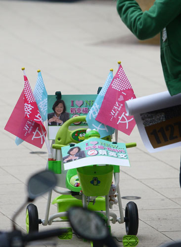 “五都”市长选举进入倒数阶段,民众24日在儿童三轮车插上候选人旗子,形成另类宣传车。 图片来源:“中央社”