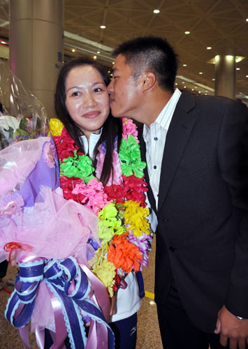 “嫁给他、嫁给他”,台湾桃园机场25日上演浪漫求婚记,亚运会自由车女子公路赛摘金的萧美玉(左)一下飞机,男友杨振坤(右)就下跪求婚,并送上亲吻。 图片来源:“中央社”