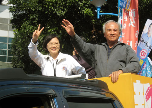 距“5都”投票不到24小时,民进党前主席林义雄(右)26日陪同新北市长候选人蔡英文(左)车队扫街、强力催票,蔡英文表示,新北市这一仗一定要赢。 图片来源:“中央社”