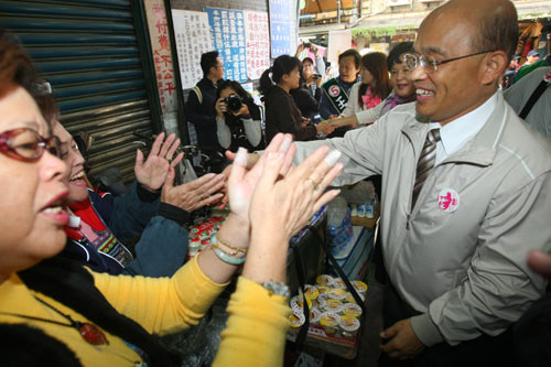 民进党台北市长候选人苏贞昌(前右)26日前往大龙市场拜票,支持者拍手高喊“冻蒜”。 图片来源:“中央社”