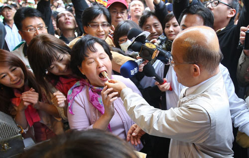 民进党台北市长候选人苏贞昌(前右)26日前往大龙市场拜票,店家送给苏贞昌菜头粿,象征好彩头,苏贞昌叉了1块给妻子詹秀龄(前左3)品尝。 图片来源:“中央社”