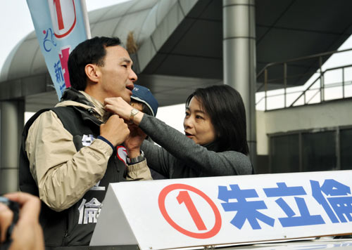 中国国民党新北市长候选人朱立伦(左起)与太太高婉倩连日一同扫街拜票,在选前最后1天26日车队出发前,高婉倩不忘贴心替朱立伦整理服装,夫妻之情溢于言表。 图片来源:“中央社”