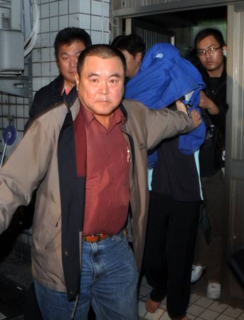 国民党荣誉主席连战儿子连胜文26日晚在台北县永和为人站台助选遭枪击,凶嫌林正伟(中蓝衣覆盖者)被逮捕后在永和分局接受侦讯。
