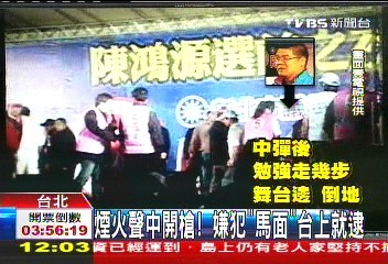 遭枪击的连胜文,当时还勉强地往舞台边走了几步,突然蹦一声,倒卧在地,开枪的凶手林正伟,在面对舞台的左边,第一时间被警察跟民众压制在地。
