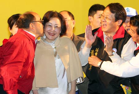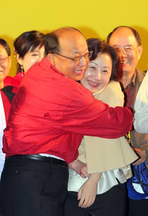 国民党籍台中市长候选人胡志强(左)27日在台中市竞选总部自行宣布当选台中市长,在群众鼓舞下亲吻、拥抱妻子邵晓铃(左2),感谢她的支持与陪伴。“中央社”图